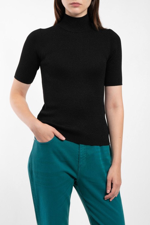 Детали: Женский черный гольф из вискозного микса от Max Mara Leisure (Макс Мара Лэжэ). Классическая длина, короткие рукава, модель с люрексом, высокий воротник-стойка с отворотом