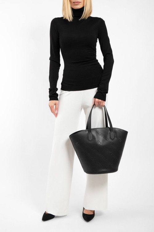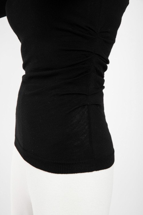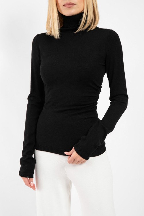 Детали: Женский черный гольф из шерсти от Moschino (Москино). Высокий воротник-стойка с отворотом, длинные рукава, приталенный силуэт, принт на спине
