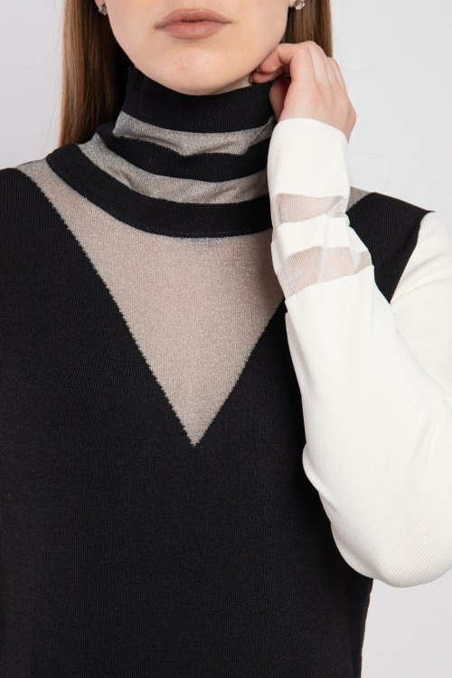 Женский черный гольф из вискозы от Pinko (Пинко). Высокий воротник-стойка, серебристая вставка на груди, белые рукава, нижний край в рубчик, классическая длина