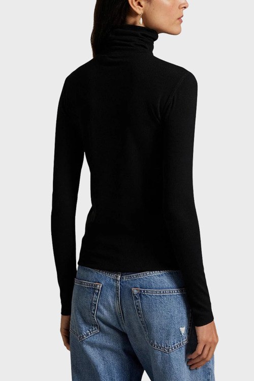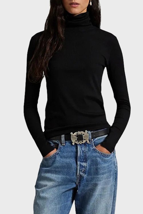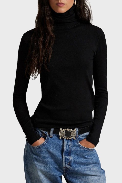 Детали: Женский черный гольф из хлопкового микса от Polo Ralph Lauren (Поло Ральф Лорен). Высокий воротник-стойка с отворотом, длинные рукава, облегающий силуэт