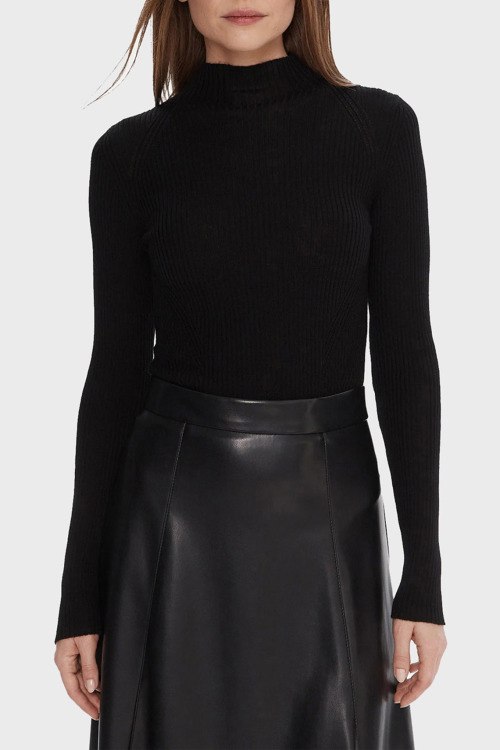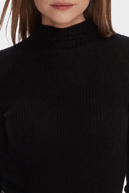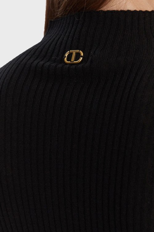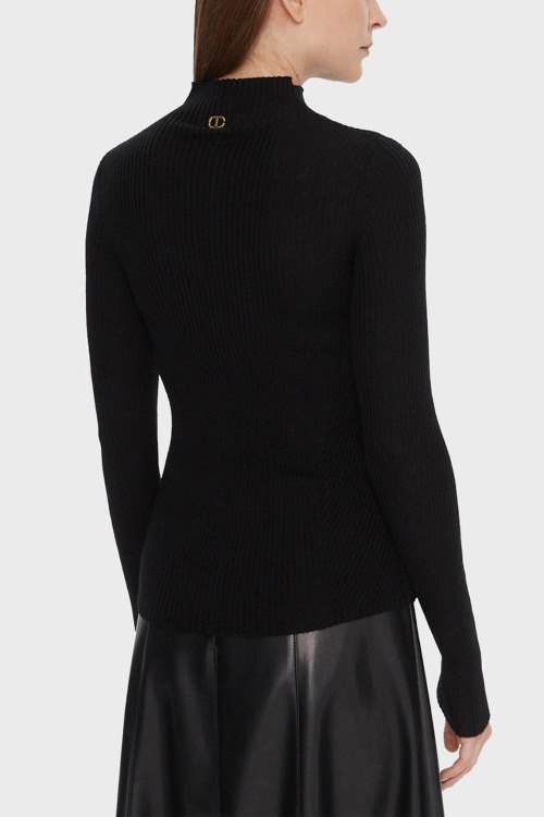 Детали: Женский черный шерстяной гольф от TWINSET (Твинсет). Облегающий фасон, дизайн в рубчик, нашивка с логотипом сзади на кокетке, воротник-стойка, классическая длина
