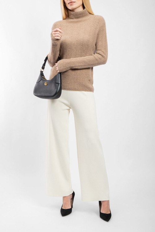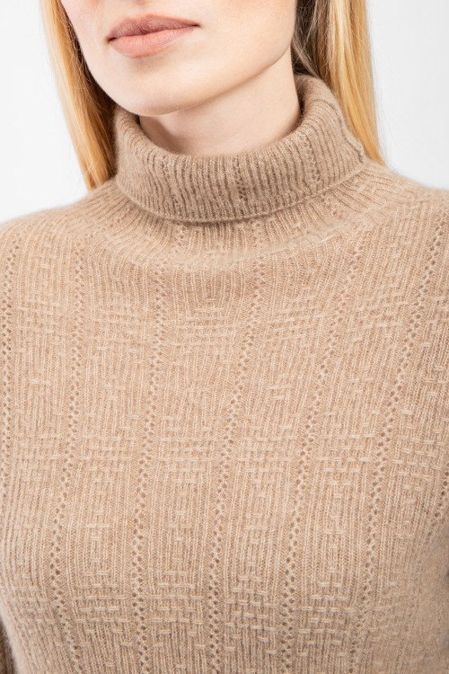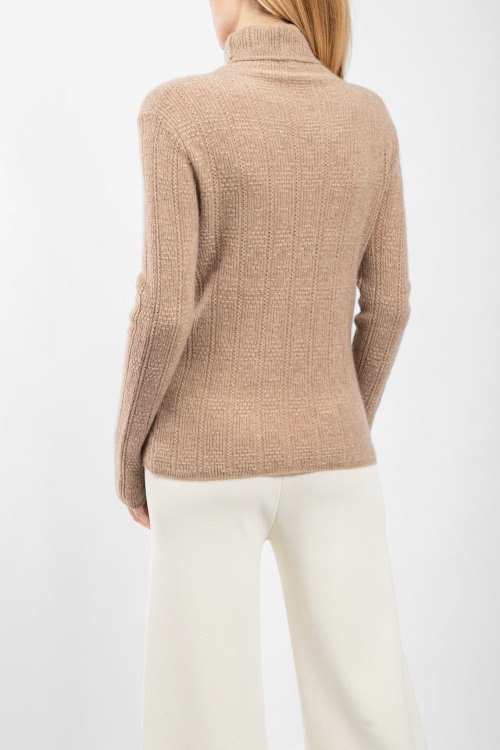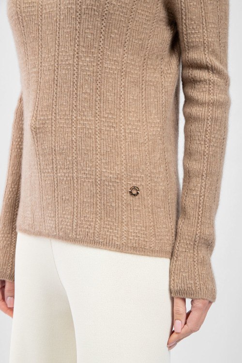 Детали: Женский кашемировый гольф цвета кэмел от Loro Piana (Лоро Пьяна). Вязаный узор, высокая горловина, нашивка с логотипом, классическая длина