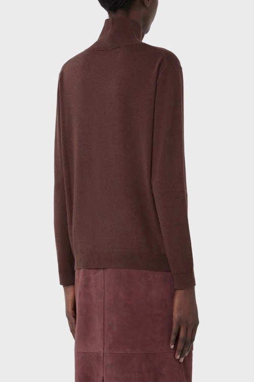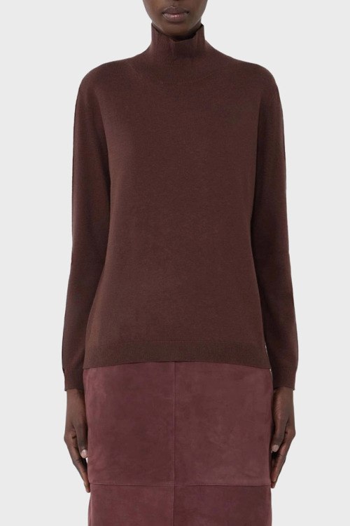 Детали: Женский темно-коричневый гольф из шелка и шерсти Kiku от Max Mara Weekend (Макс Мара Викенд). Высокая горловина, длинный рукав, классическая длина, манжеты и нижний край в рубчик
