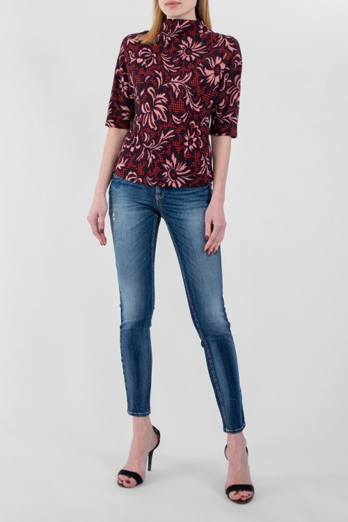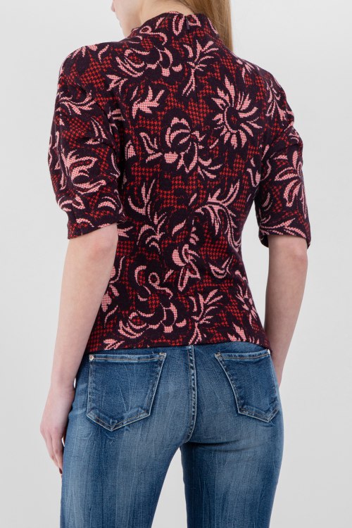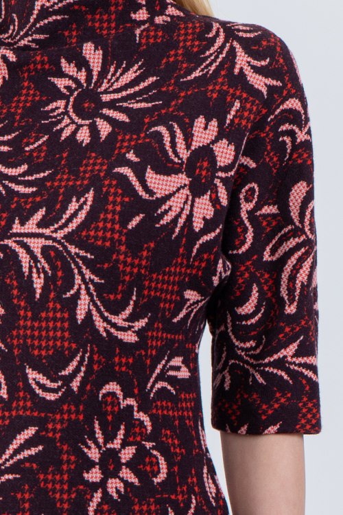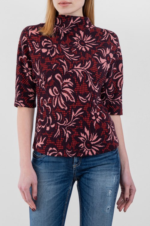 Детали: Женский бордовый гольф из шерстяного микса от Pinko (Пинко). Классическая длина, модель с коротким рукавом, высокий воротник-стойка, дизайн с цветочным узором по всей поверхности, ровный низ изделия