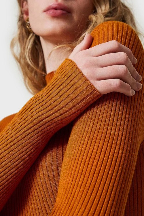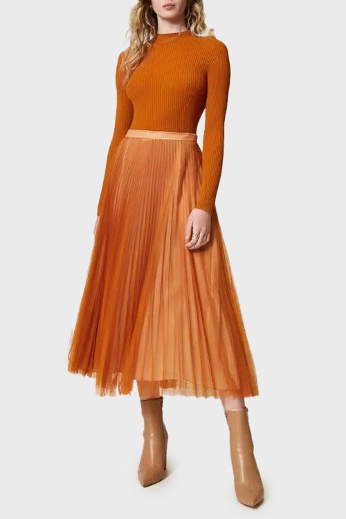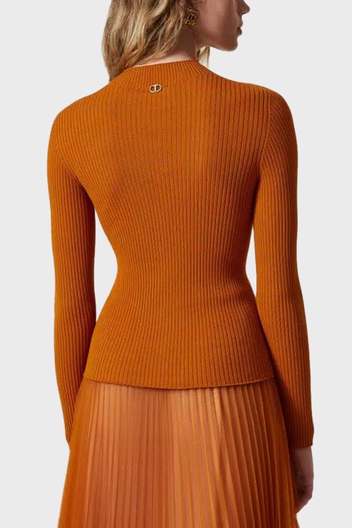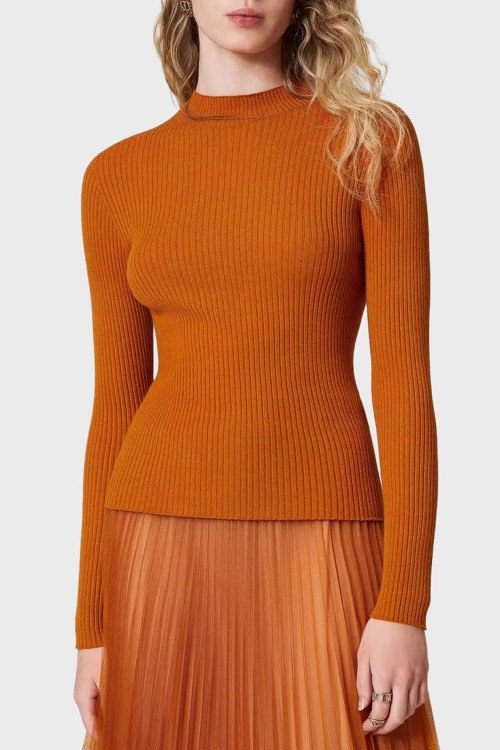 Детали: Женский оранжевый гольф из вискозного микса от TWINSET (Твинсет). Воротник-стойка, длинный рукав, дизайн в рубчик, металлический логотип бренда