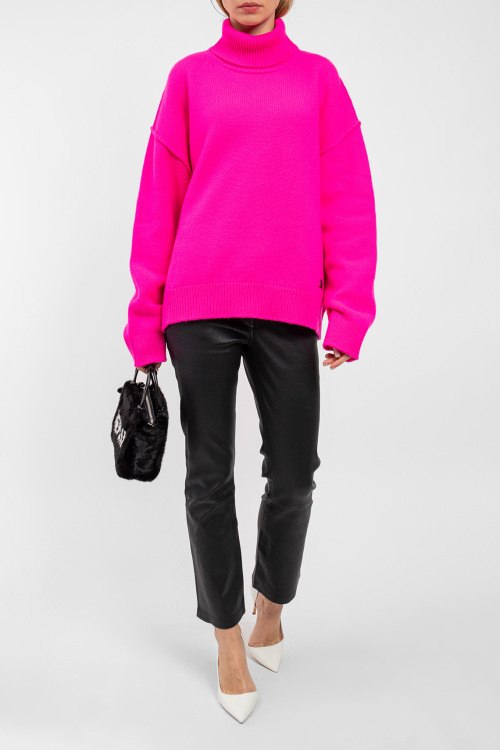 Детали: Женский розовый гольф из микса шерсти и кашемира от Dsquared2 (Дискваред). Высокий воротник-стойка с отворотом, длинные рукава, трикотажная резинка на манжетах и по низу изделия, металлический логотип бренда