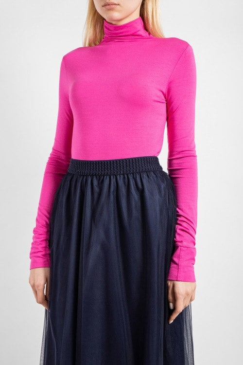 Женский розовый гольф из вискозного микса от NIU (Ниу). Классическая длина, высокий воротник с отворотом, длинные рукава, трикотажные манжеты