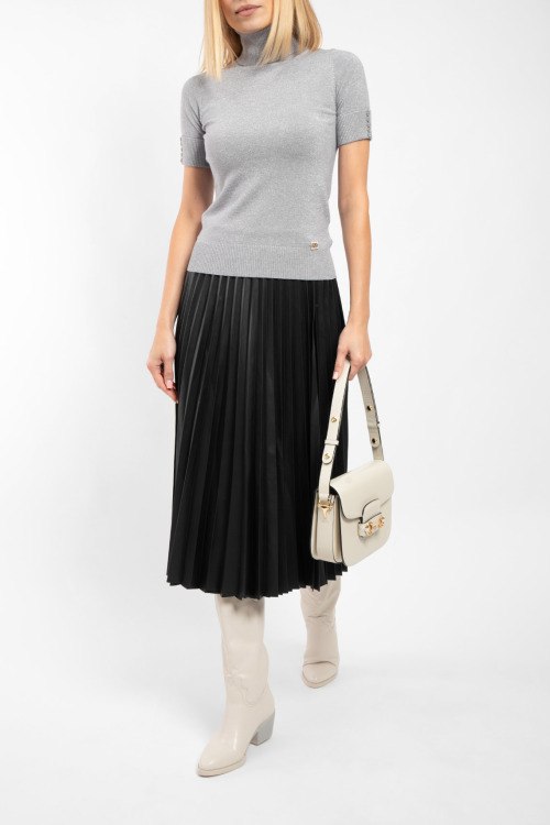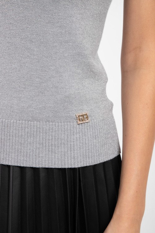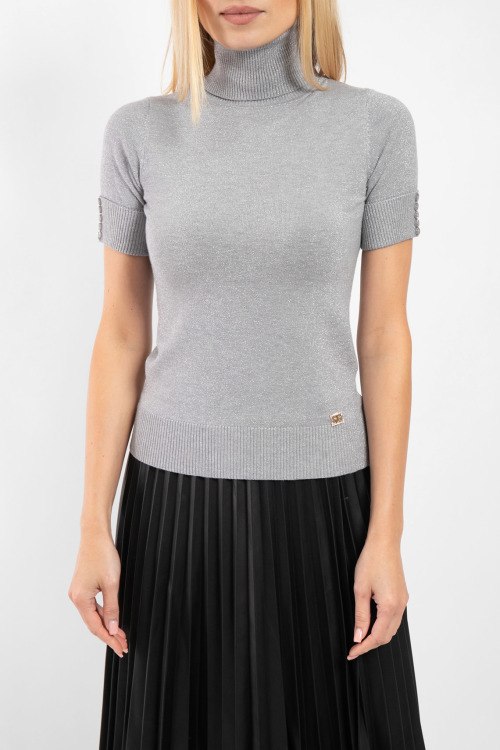 Женский серебристый гольф из вискозного микса от Roberta Biagi (Роберта Бьяджи). Классическая длина, высокий воротник-стойка с отворотом, короткие рукава, модель декорирована люрексовой нитью. Измерения: длина изделия: 56 см, ширина по груди: 37 см, ширина по талии: 36 см, длина рукава по внутреннему шву: 9 см, ширина рукава: 12 см.