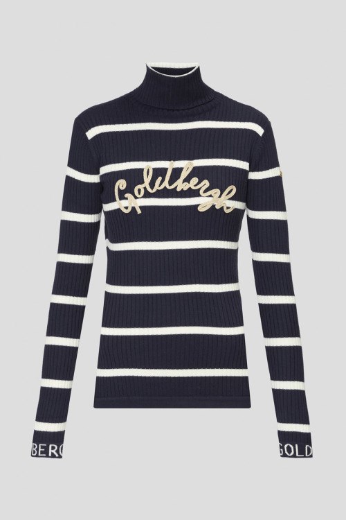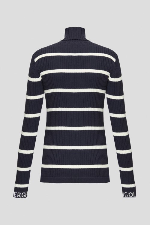 Детали: Женский темно-синий гольф в полоску из акрила и шерсти от Goldbergh (Голдберг). Дизайн в рубчик, высокий воротник-стойка, длинные рукава, модель в полоску, логотип бренда