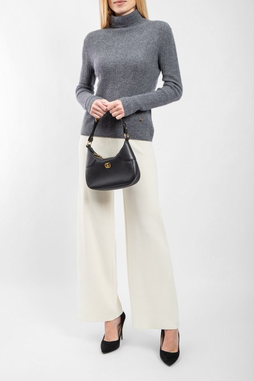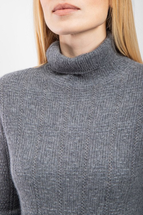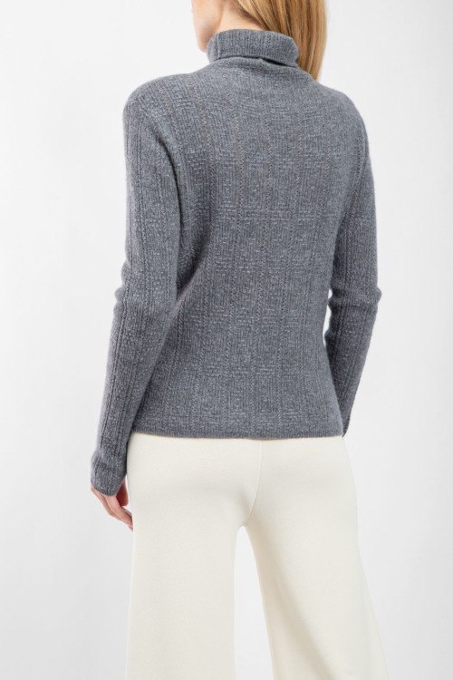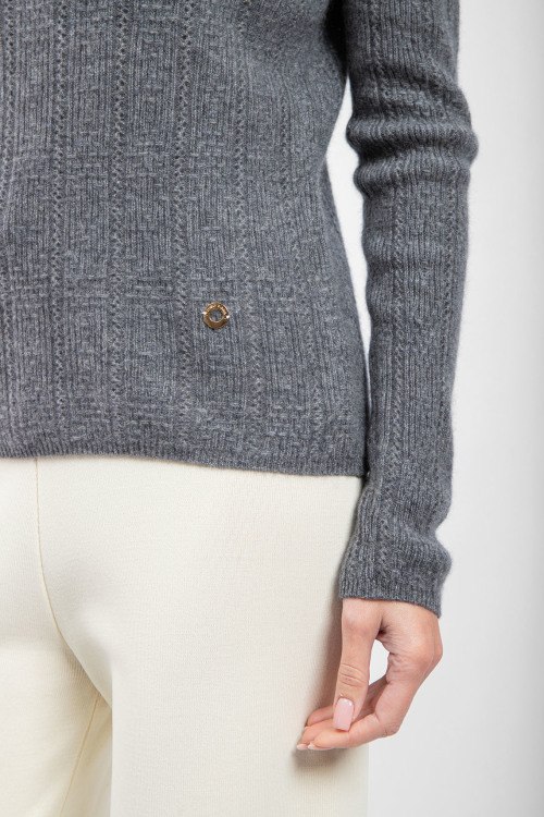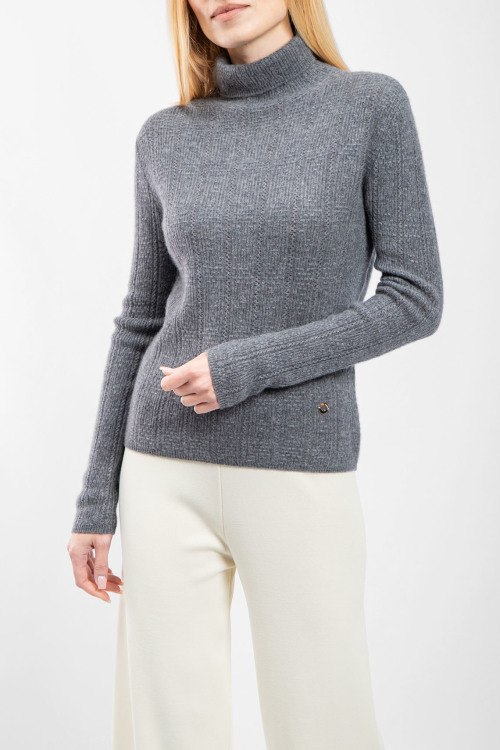 Детали: Женский темно-серый кашемировый гольф от Loro Piana (Лоро Пьяна). Вязаный узор, высокая горловина, нашивка с логотипом, классическая длина