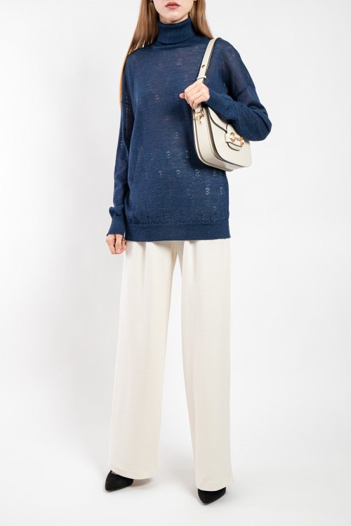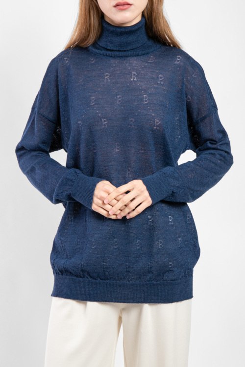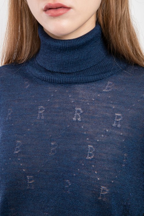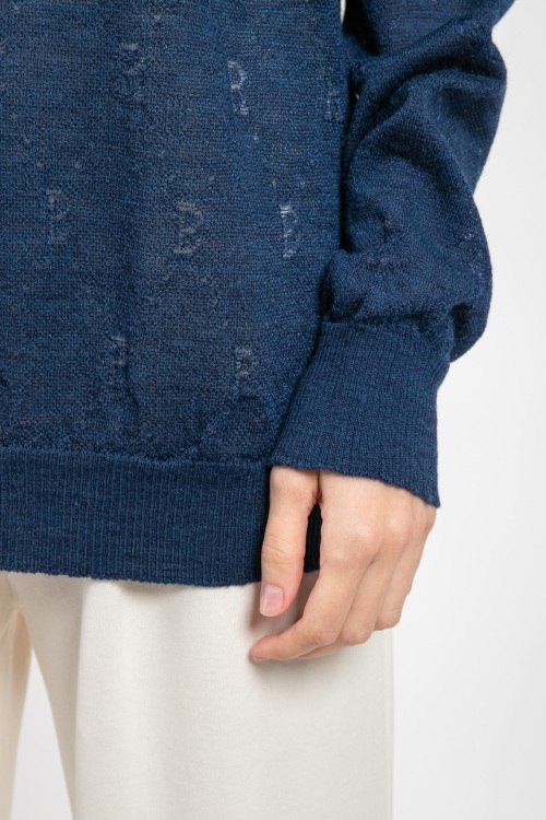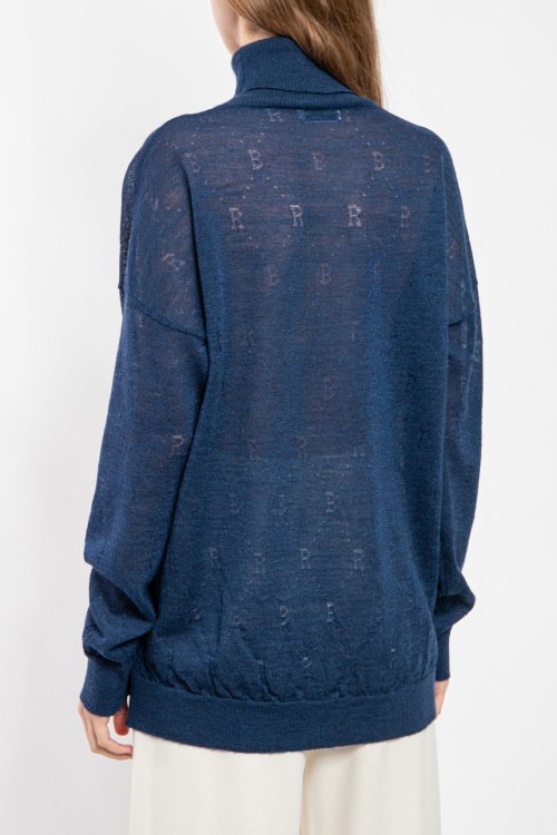 Женский темно-синий гольф из шерстяного микса от Barbara Alvisi (Барбара Алвиси). Удлиненная модель, высокий воротник-стойка с отворотом, полупрозрачная модель, дизайн с монограммой, низ изделия и манжеты с трикотажной резинкой. Замеры для размера: S-M длина: 69 см, ширина по груди: 59 см, ширина по талии: 56 см, ширина по бёдрам: 52 см, длина рукава по внутреннему шву: 51,5 см, ширина рукава: 18 см.