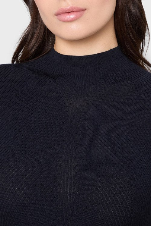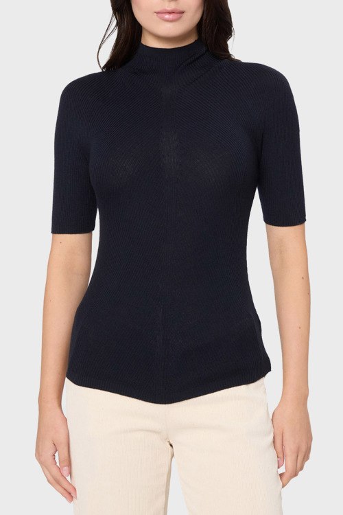 Детали: Женский темно-синий гольф из шерсти от Hugo Boss (Хуго Босс). Воротник-стойка, дизайн в рубчик, короткие рукава, логотип бренда