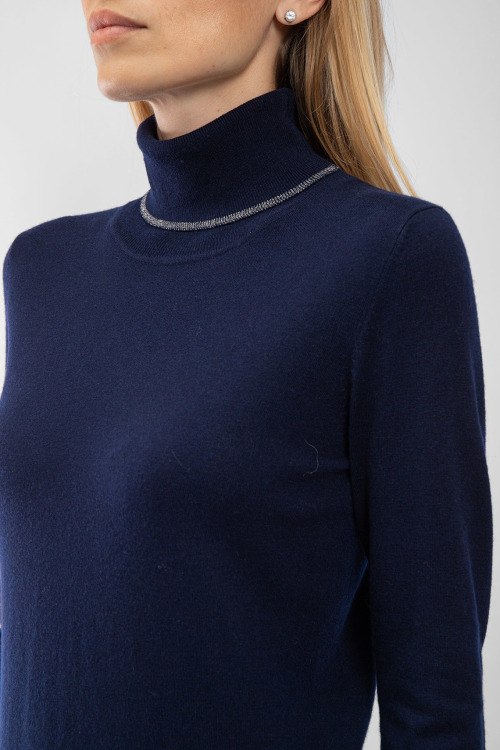 Женский темно-синий трикотажный гольф от Kocca (Кокка). Высокая горловина с отделкой из люрекса, классическая длина, манжеты и нижний край в рубчик.