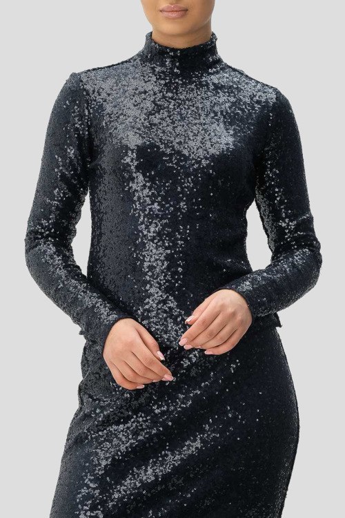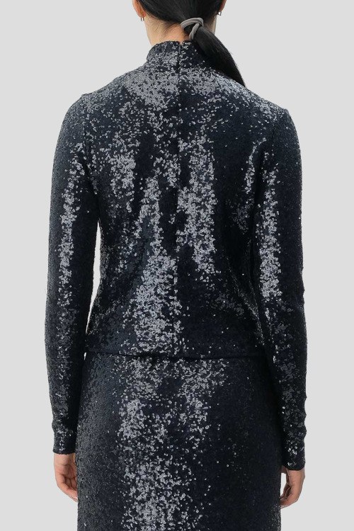 Детали: Женский темно-синий гольф из полиэстера и эластана от Polo Ralph Lauren (Поло Ральф Лорен). Воротник-стойка, длинные рукава, модель декорирована пайетками по всей поверхности изделия