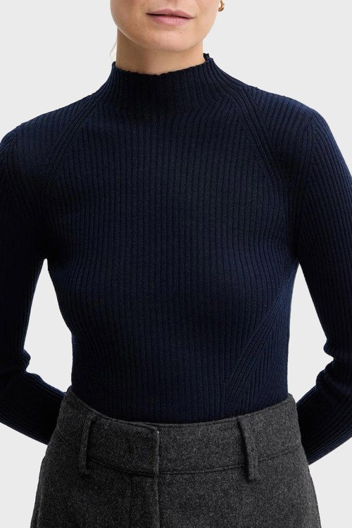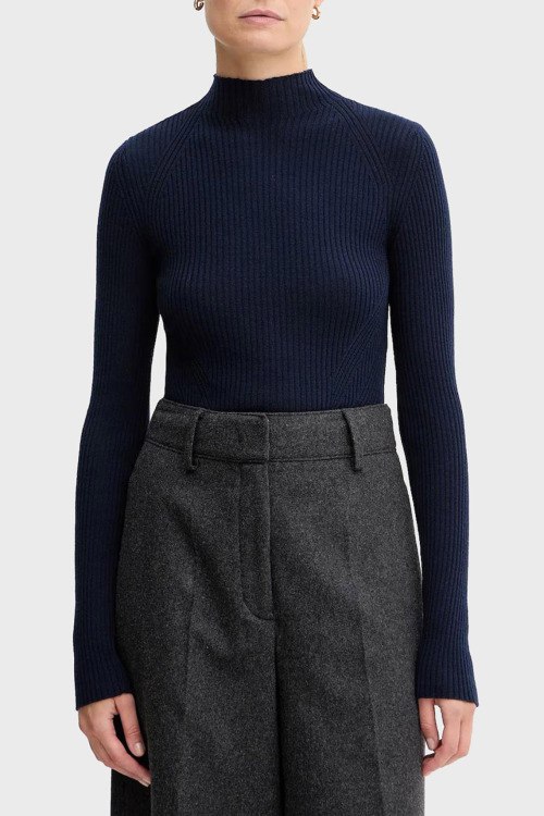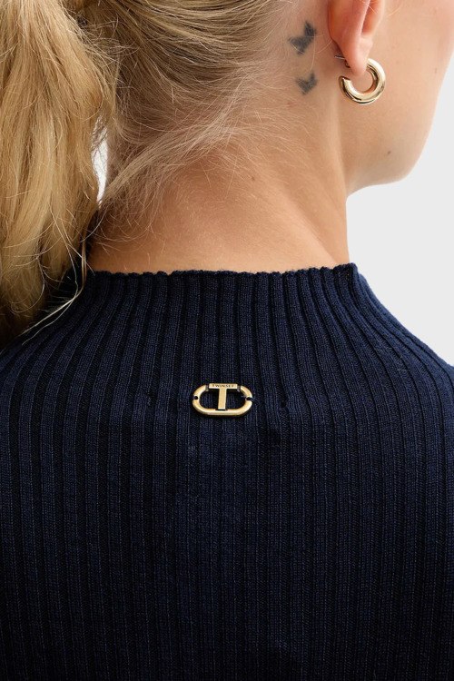 Детали: Женский темно-синий шерстяной гольф от TWINSET (Твинсет). Облегающий фасон, дизайн в рубчик, нашивка с логотипом сзади на кокетке, воротник-стойка, классическая длина