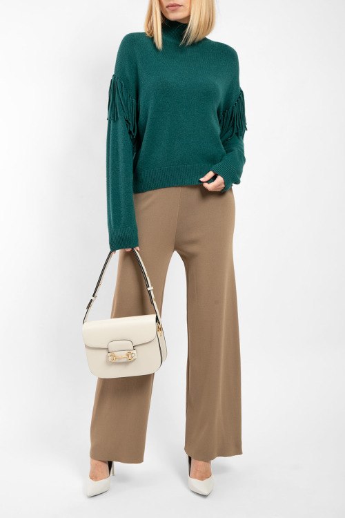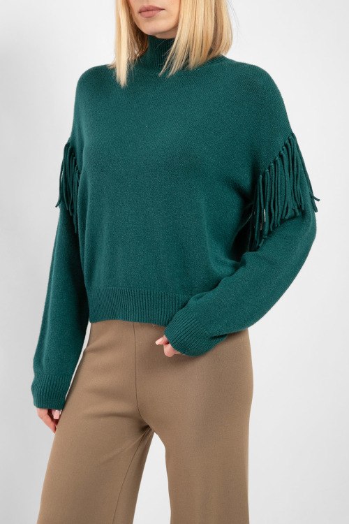 Детали: Женский зеленый гольф из вискозы и полиэстера от Kocca (Кокка). Высокий воротник-стойка с отворотом, длинные рукава, приспущенная линия плеча с бахромой, манжеты и низ изделия в рубчик, нашивка с логотипом бренда
