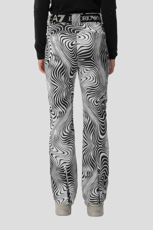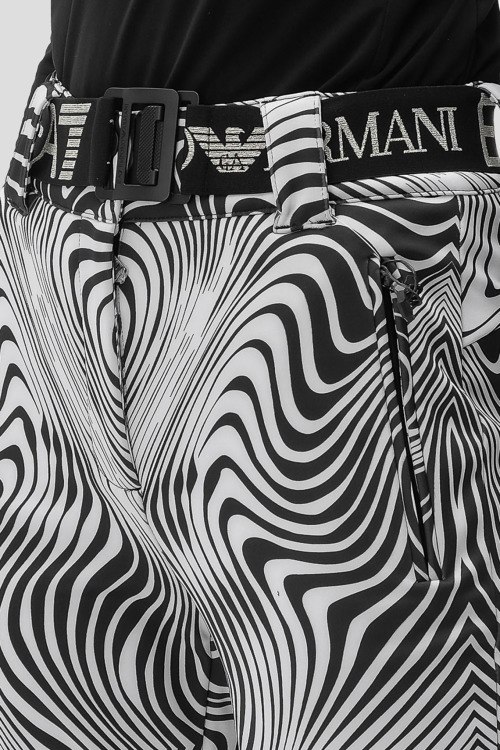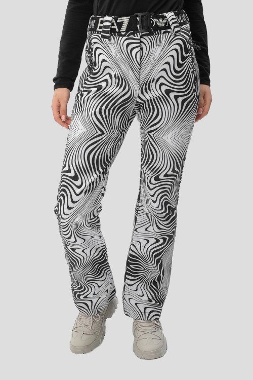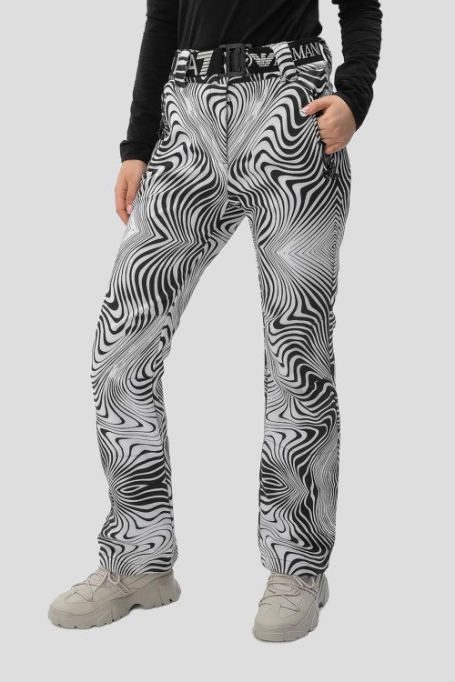 Детали: Женские черно-белые горнолыжные брюки из полиэстера от EA7 Emporio Armani (ЕА7 Эмпорио Армани). Классическая длина, застежка на молнию и пуговицу, эластичная резинка на поясе, прорезные карманы, манжеты на молнии, водонепроницаемая модель