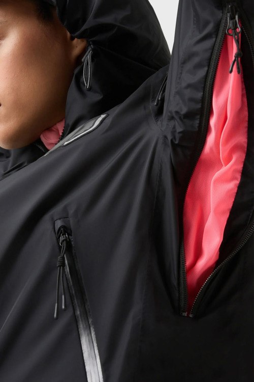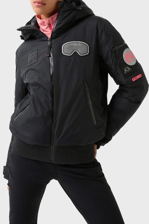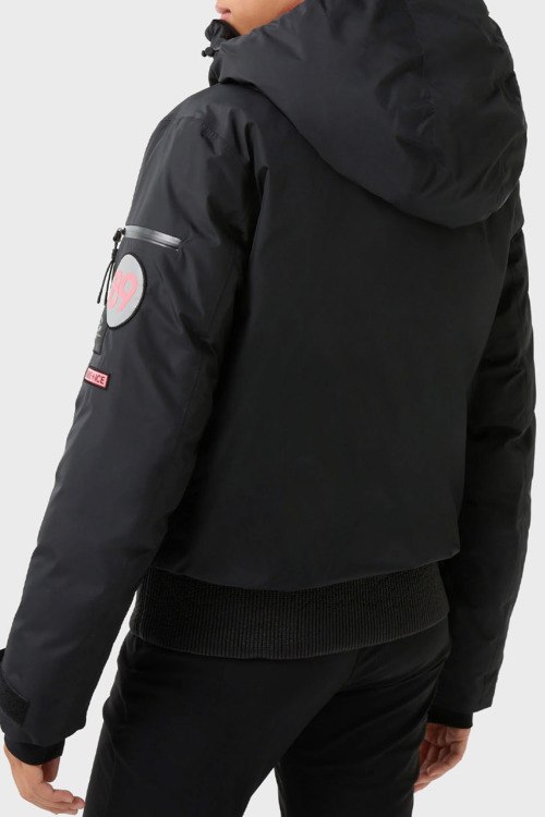 Детали: Женская черная куртка Emely от Bogner Fire+Ice (Богнер Фаер+Айс). Высокий воротник-стойка, застежка на молнию, вшитый капюшон, на теплой подкладке Thermore Ecodown, модель с водоотталкивающим покрытием, водонепроницаемая и дышащая. патч лого