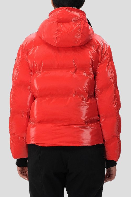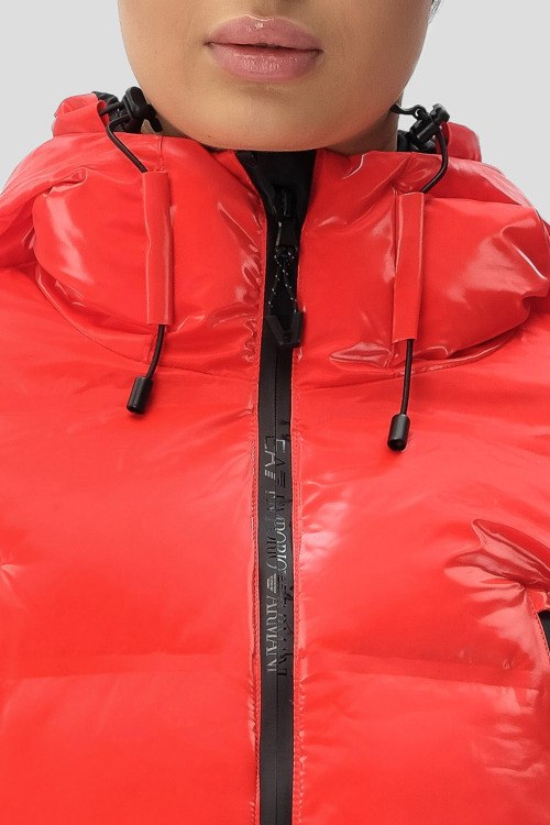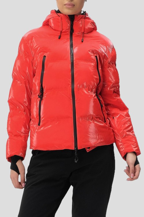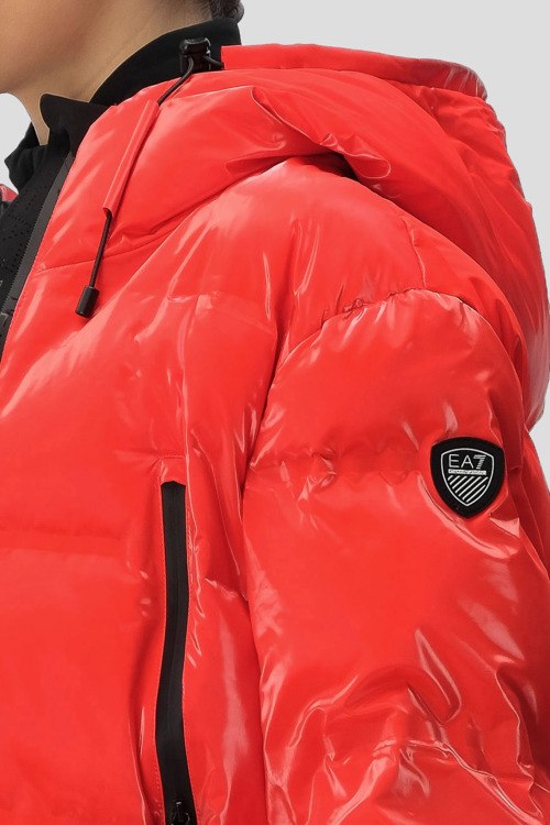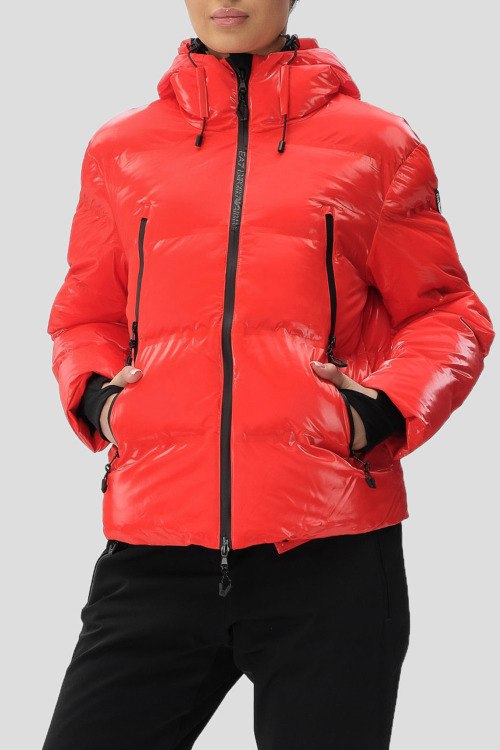 Детали: Женская красная лыжная куртка из полиэстера от EA7 Emporio Armani (ЕА7 Эмпорио Армани). Стеганый дизайн, высокий воротник-стойка, застежка на молнию, вшитый капюшон, прорезные карманы на молнии, манжеты с прорезями для большого пальца, модель утепленная синтепоном, патч-лого
