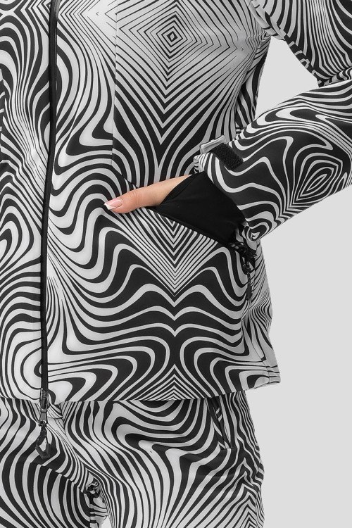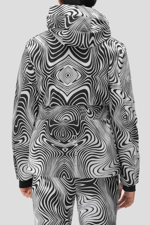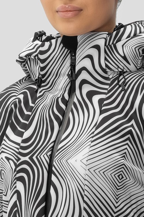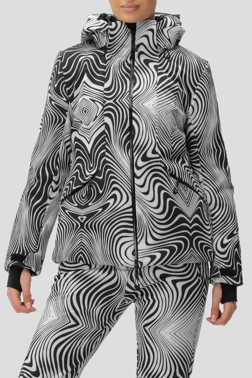 Детали: Женская черно-белая горнолыжная куртка из полиэстера от EA7 Emporio Armani (ЕА7 Эмпорио Армани). Дизайн с узором, высокий воротник-стойка, застежка на молнию, капюшон с утяжкой, прорезные карманы, снежная юбка, манжеты с прорезями для большого пальца
