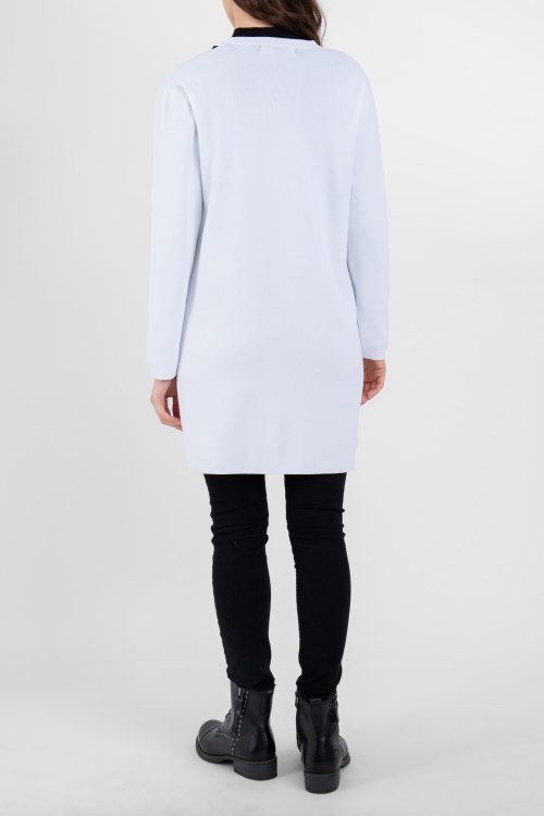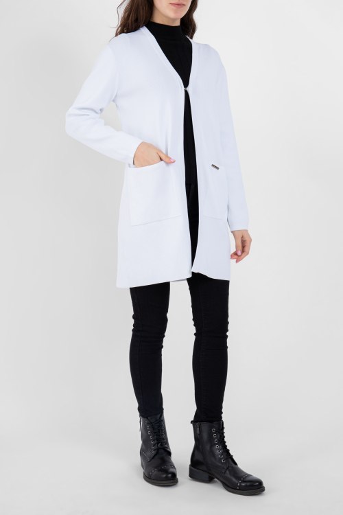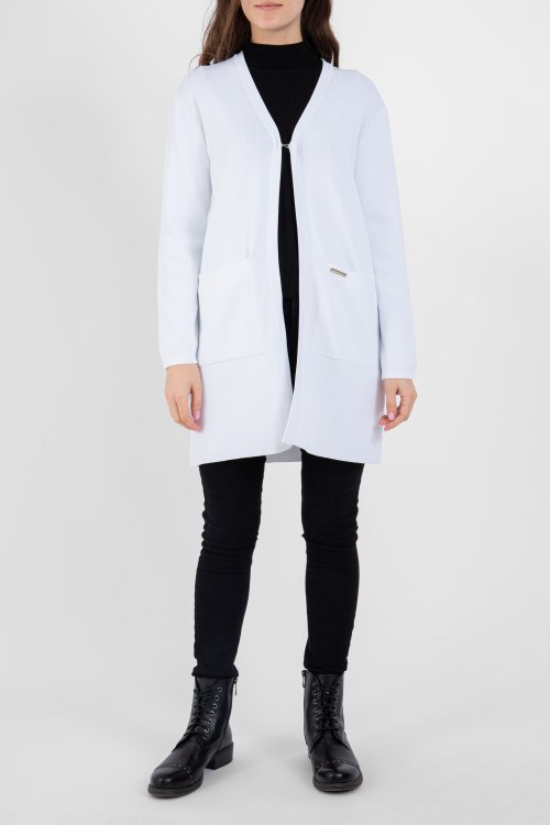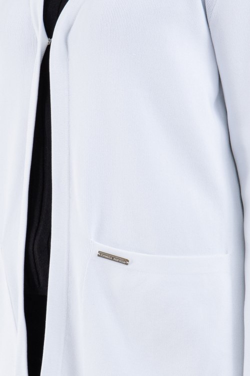 Детали: Женский белый кардиган из вискозного микса Frankie Morello (Франки Морелло). Удлиненная длина, передник карманы, нашивка с логотипом, застегивается на крючок