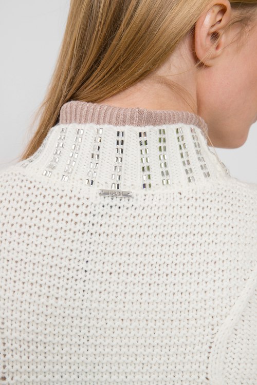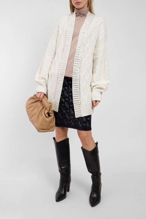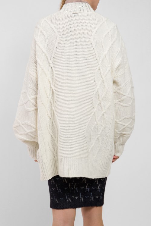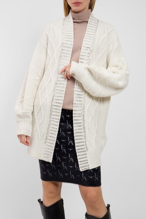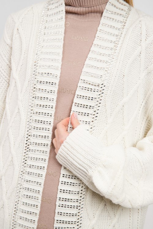 Женский белый шерстяной кардиган от Liu Jo (Лиу Джо). Комбинированная вязка, декор серебристым бисером, без застежки, удлиненная длина.