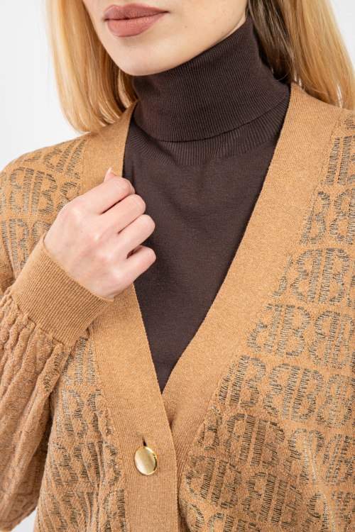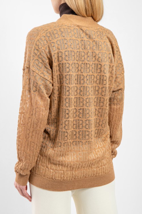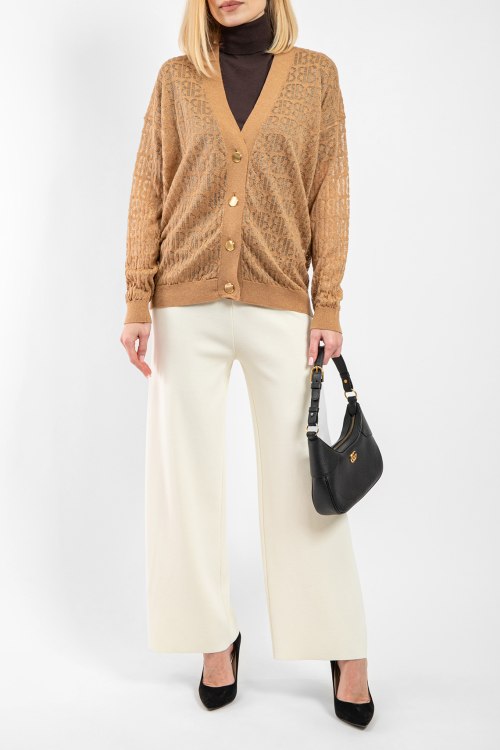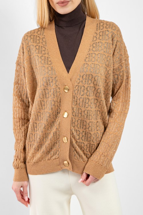 Женский бежевый трикотажный кардиган от Barbara Alvisi (Барбара Алвиси). Модель с примесью шерсти, монограмма по всей поверхности, V-образный вырез, застежка на золотистые пуговицы, манжеты и нижний край в рубчик, классическая длина.