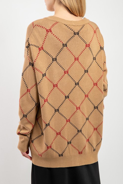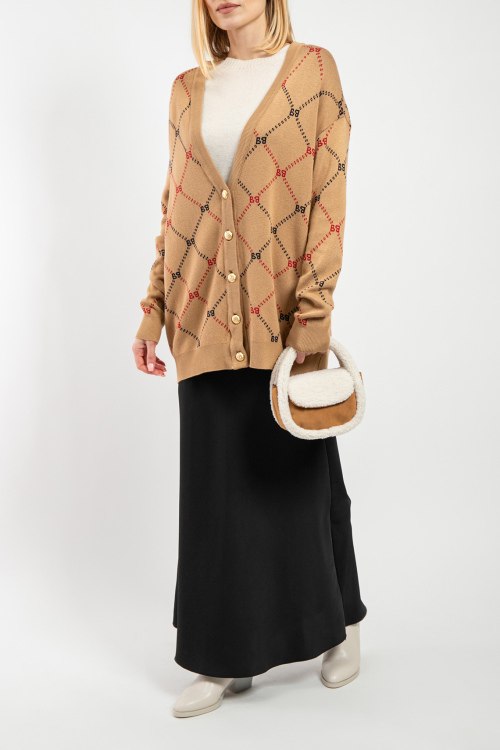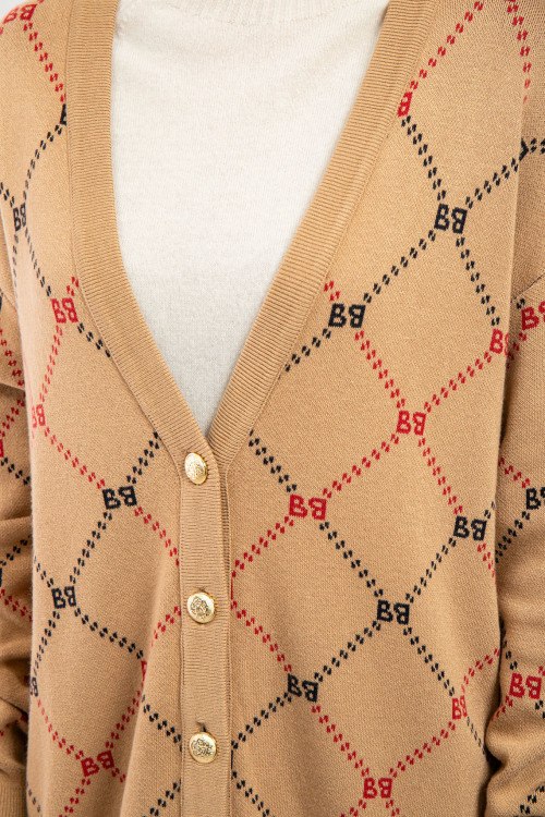 Женский бежевый трикотажный кардиган от Barbara Alvisi (Барбара Алвиси). Ромбовидный узор с монограммой по всей поверхности, V-образный вырез, фасон oversize, застежка на золотистые пуговицы, удлиненная длина.