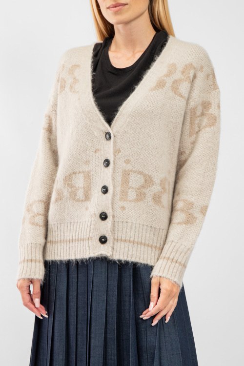 Женский бежевый кардиган из акрила и мохера от Barbara Alvisi (Барбара Алвиси). Узор с монограммой, V-образный вырез, застежка на пуговицы, классическая длина. На модели снят размер - S-M. Параметры модели: рост 177 см, 88-62-90 см. Замеры: длина: 63 см, ширина по груди: 61 см, ширина по талии 58 см, ширина рукава 21 см, длина рукава 48 см