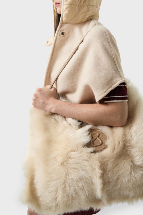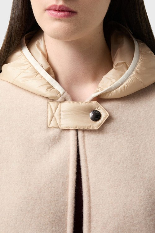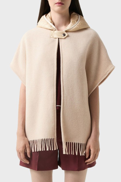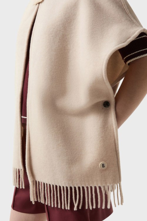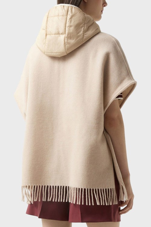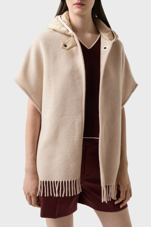 Детали: Женское бежевое шерстяное пончо Nilla от Bogner (Богнер). Вшитый капюшон с застежкой на кнопку, короткий широкий рукав, нашивка с логотипом, нижний край с бахромой