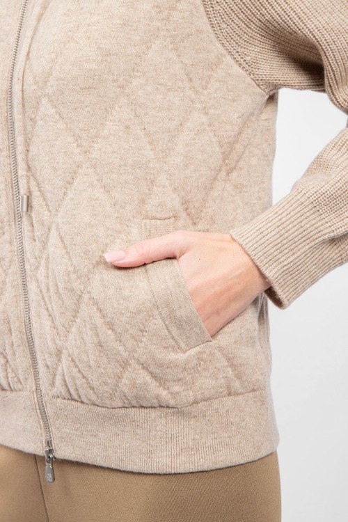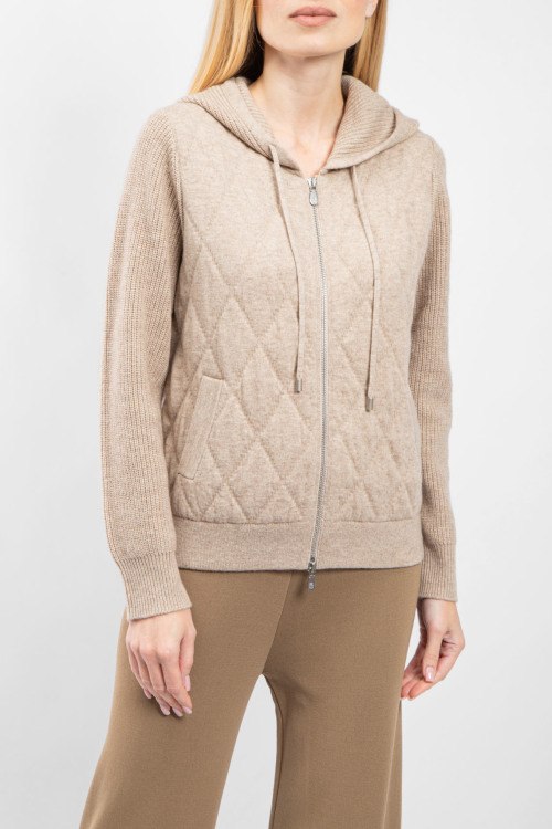 Женский бежевый кашемировый кардиган от Brunello Cucinelli (Брунелло Кучинелли). Модель с капюшоном, ромбовидный узор, боковые карманы, застежка-молния, классическая длина.