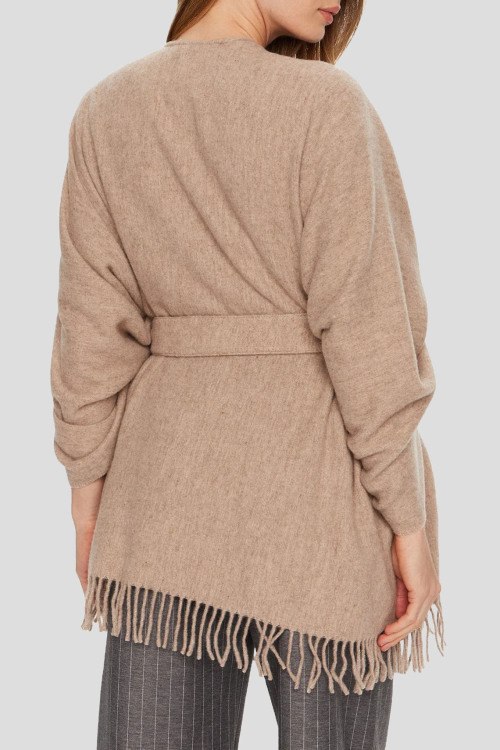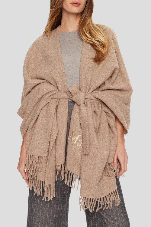 Детали: Женское бежевое шерстяное пончо Martora от Max Mara (Макс Мара). Вышитый логотип, в талии с поясом в тон изделия, нижний край декорирован бахромой