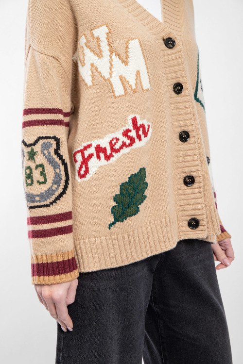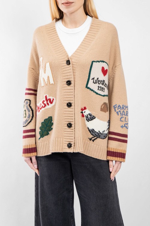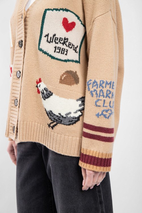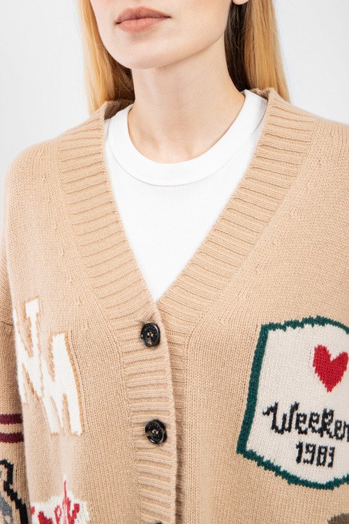 Женский бежевый шерстяной кардиган Belgio от Max Mara Weekend (Макс Мара Викенд). Узор по всей поверхности, V-образный вырез, застежка на пуговицы, классическая длина.