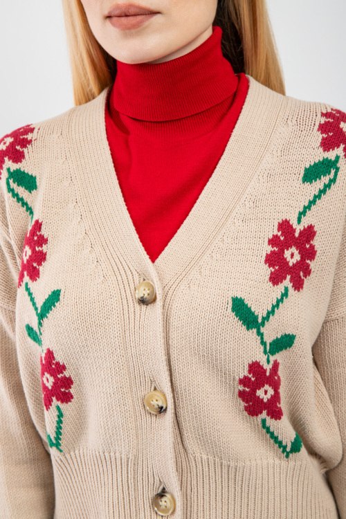 Женский бежевый кардиган из хлопка и акрила от Max Mara Weekend (Макс Мара Викенд). V-образный вырез горловины, застежка на пуговицы, длинные рукава, трикотажная резинка на манжетах и по низу изделия, цветочный принт, приспущенная линия плеча.