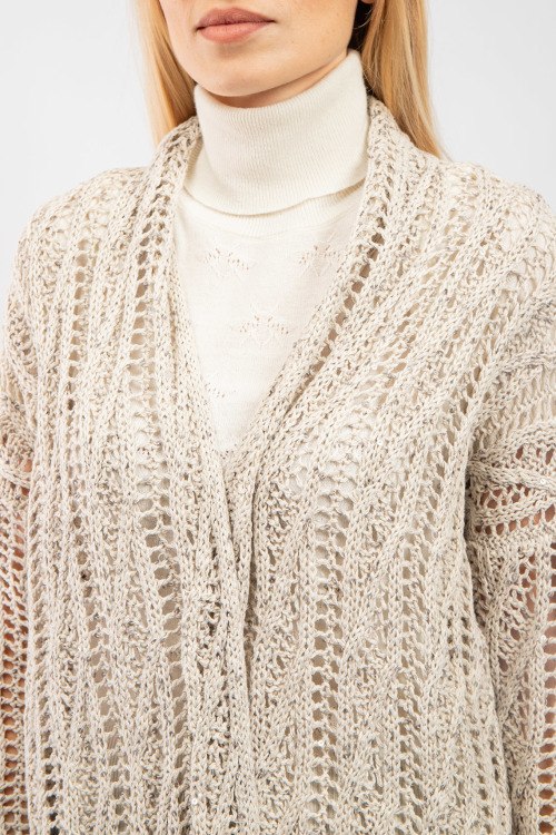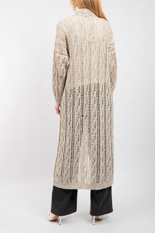 Детали: Женский бежевый длинный кардиган из льна и хлопка от Panicale Cashmere (Паникале Кашемир). Комбинация материалов, модель без застежки, крупная вязка, длина-миди. Размер вещи на фото: 44. Замеры: длина: 120 см, ширина груди 60 см, ширина по талии 55 см, ширина по бедрам: 57 см, длина по внутреннему шву рукава 43 см, ширина рукава 20 см