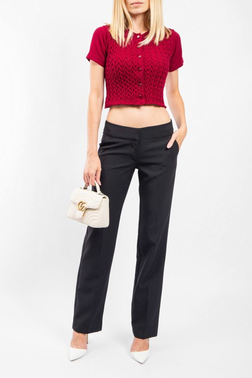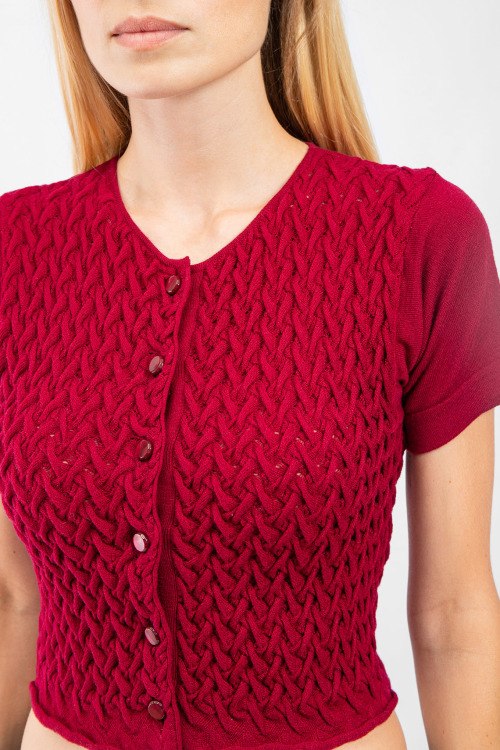 Детали: Женский бордовый кардиган из шерсти и полиэстера от Emporio Armani (Эмпорио Армани). Укороченная модель, приталенный фасон, короткие рукава, круглый вырез горловины, фактурный узор