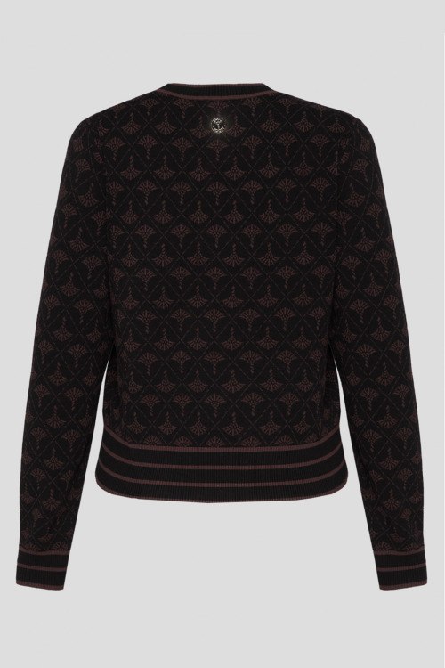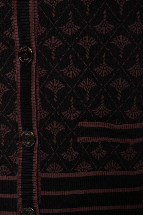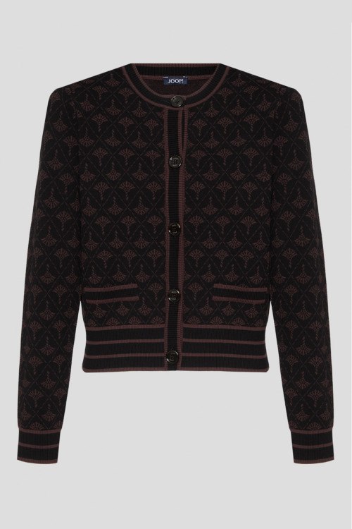 Детали: Женский черный трикотажный кардиган от Joop! (Йооп!). Узор паттерн-лого, круглый вырез горловины, застежка на пуговицы. Длина рукава: длинный, для размера 36 - 63 см, обхват груди: для размера 36 - 94 см, обхват талии: для размера 36 - 98 см, длина изделия по среднему шву спинки от горловины: для размера 36 - 53 см