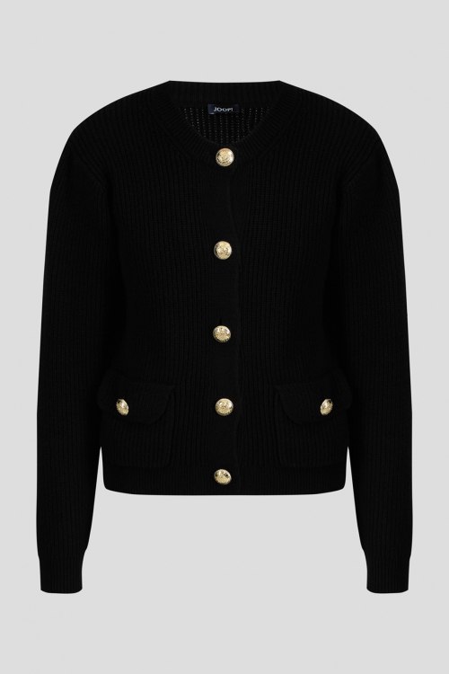 Детали: Женский черный кардиган из вискозы от Joop! (Йооп!). Прямой фасон, круглый вырез горловины, застежка на пуговицы, золотистая брендированная фурнитура. Замеры: длина рукава: длинный, для размера 36 - 60 см, обхват груди: для размера 36 - 100 см, обхват талии: для размера 36 - 94 см, длина изделия по среднему шву спинки от горловины: для размера 36 - 51 см
