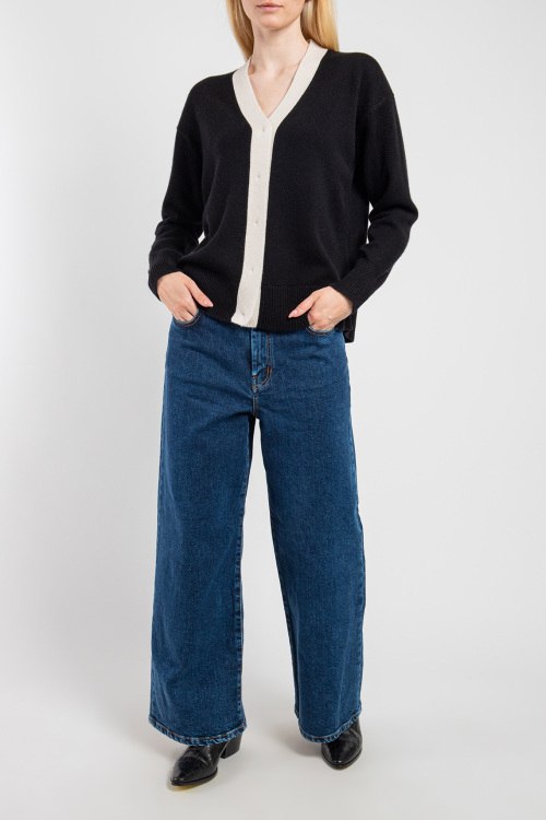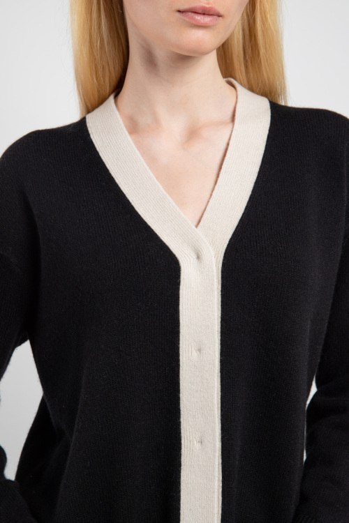 Детали: Женский черно-белый кардиган из микса шерсти и кашемира от Max Mara (Макс Мара). Средняя длина, V-образный вырез горловины, потайная застежка на пуговицы спереди, резинка на манжетах и по низу изделия, заниженная линия плеча, контрастная отделка