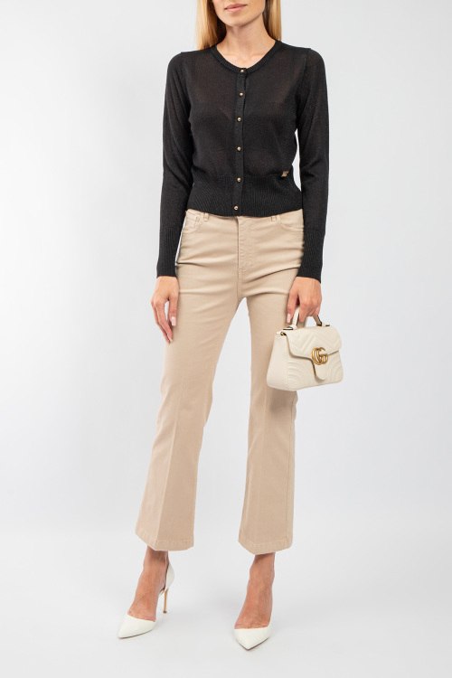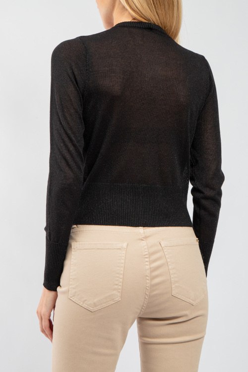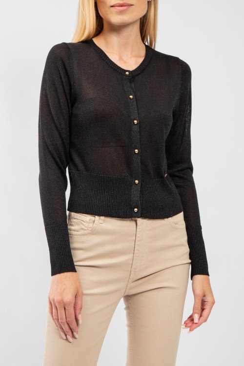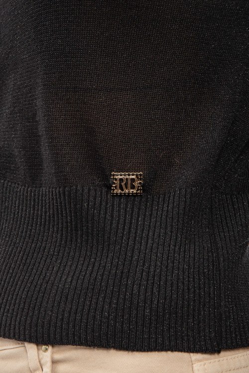 Женский черный кардиган из вискозы от Roberta Biagi (Роберта Бьяджи). Дизайн с люрексом, круглый вырез горловины, застежка на пуговицы, классическая длина, манжеты и нижний край в рубчик. На модели снят размер - UNI. Параметры модели: рост 177 см, 88-62-90 см. Замеры: длина: 47 см, ширина по груди: 43 см, ширина по талии 38 см длина рукава по внутреннему шву: 45 см, ширина рукава 14 см