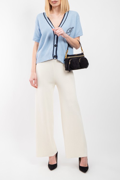 Женский голубой кардиган из хлопкового микса от Barbara Alvisi (Барбара Алвиси). V-образный вырез горловины, короткие рукава, застежка на пуговицы, декорирована вышивкой на груди. Замеры для размера S/M: длина: 58 см, ширина по груди: 57 см, ширина по талии: 53 см ширина по бедрам 47 см длина рукава по внутреннему шву: 12 см, ширина рукава: 20 см.