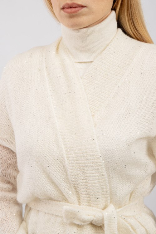 Детали: Женский кремовый кардиган из акрила и мохера от Clothe (Клозе). Декор пайетками по всей поверхности, в талии с поясом, удлиненная длина, манжеты и нижний край в рубчик. Размер вещи на фото: UNI. Замеры: длина: 78 см, ширина груди 58 см, ширина по талии 51,5 см, ширина по бедрам: 52,5 см, длина по внутреннему шву рукава 48 см, ширина рукава 19 см