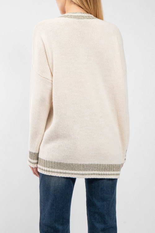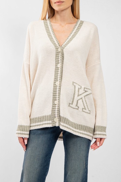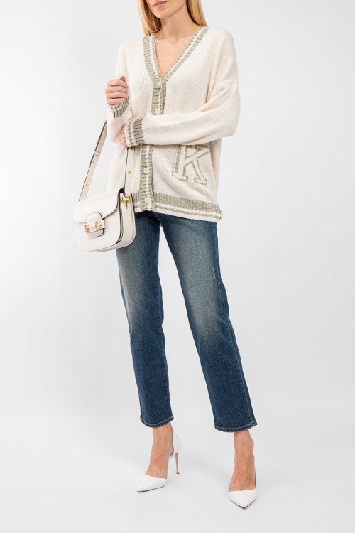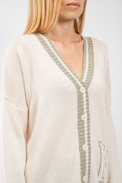 Женский кардиган молочного оттенка из акрила и шерсти от Kocca (Кокка). Классическая вязка, вышитый логотип, V-образный вырез, отделка люрексом, застежка на пуговицы, удлиненная длина.