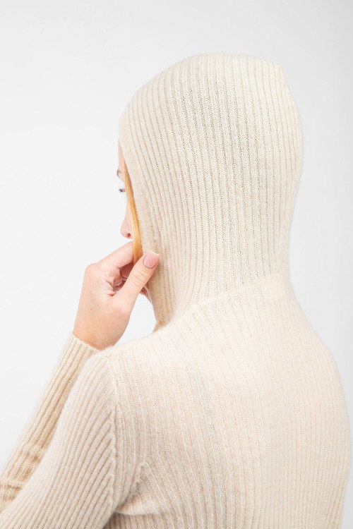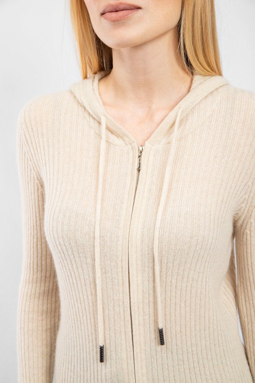 Женский кремовый кашемировый кардиган от Loro Piana (Лоро Пьяна). Модель с капюшоном, дизайн в крупный рубчик, застежка-молния, классическая длина.