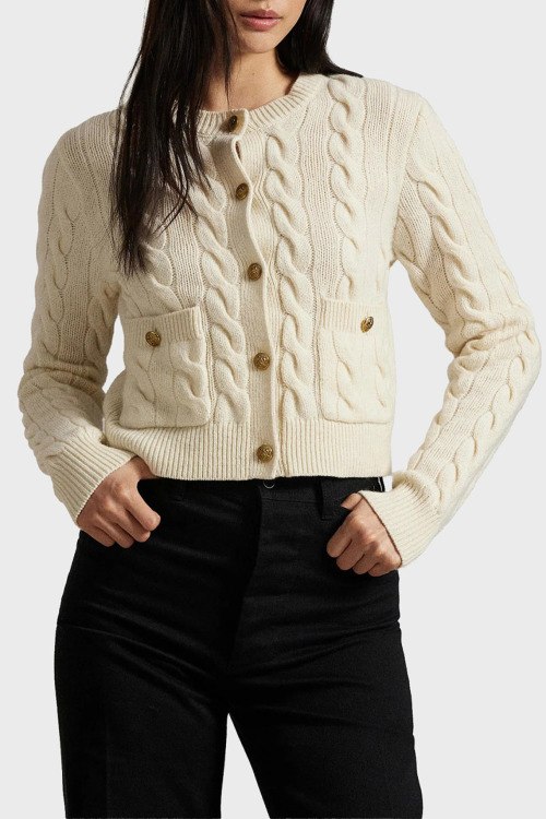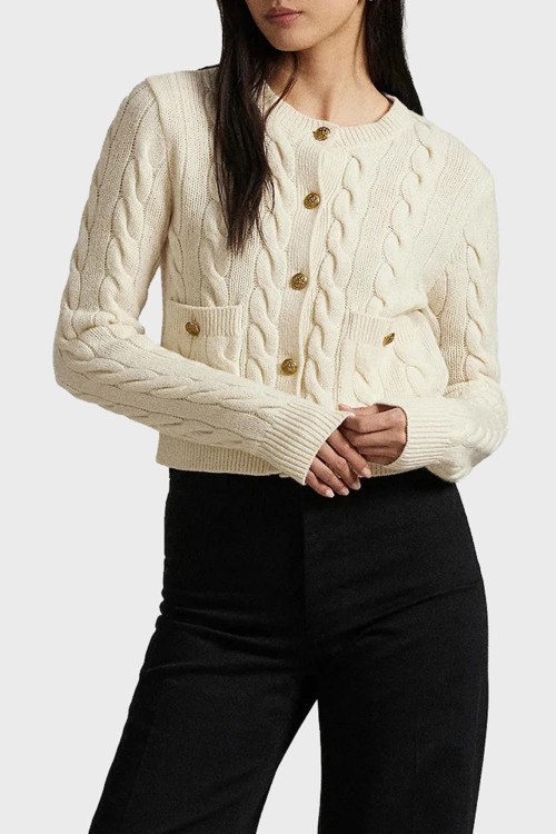 Детали: Женский кардиган молочного оттенка из шерсти и кашемира от Polo Ralph Lauren (Поло Ральф Лорен). Круглый вырзе горловины, застежка на пуговицы, длинные рукава, накладные карманы, вышитый логотип бренда, манжеты и низ изделия в рубчик