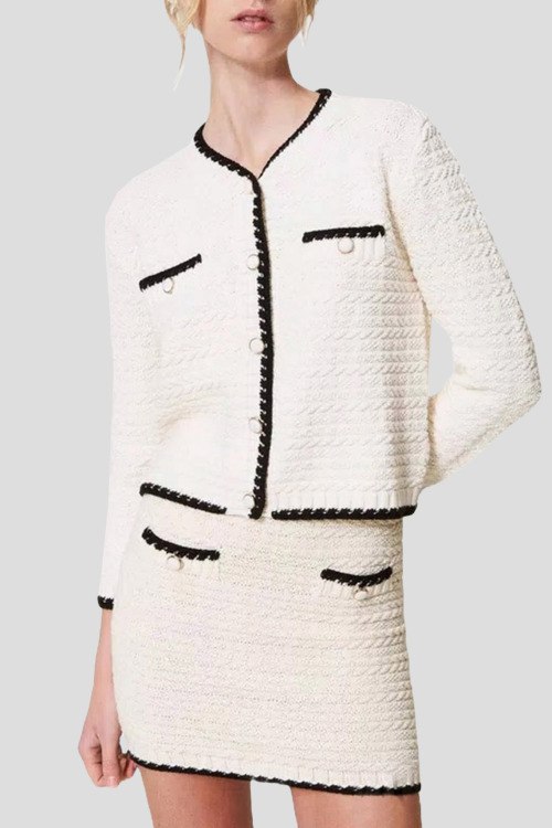 Детали: Женский кардиган молочного оттенка из хлопка от TWINSET (Твинсет). Круглый вырез горловины, застежка на пуговицы, длинные рукава, контрастная окантовка