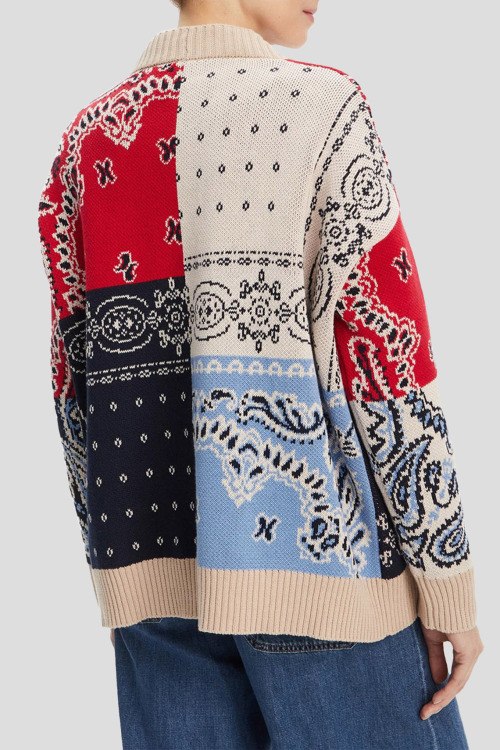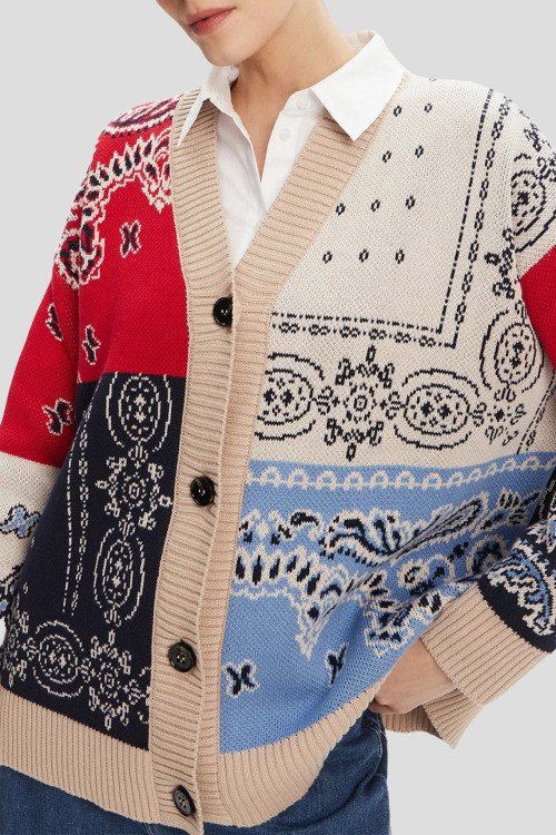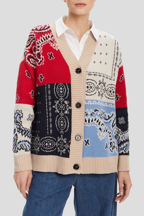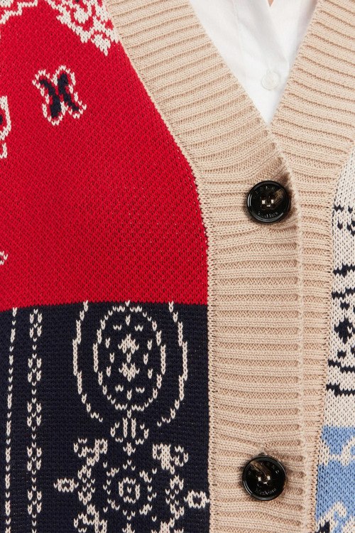 Детали: Женский разноцветный хлопковый кардиган Baobab от Max Mara Weekend (Макс Мара Викенд). Дизайн в стиле patchwork, V-образный вырез, застежка на пуговицы, узор по всей поверхности, классическая длина, манжеты и нижний край в рубчик