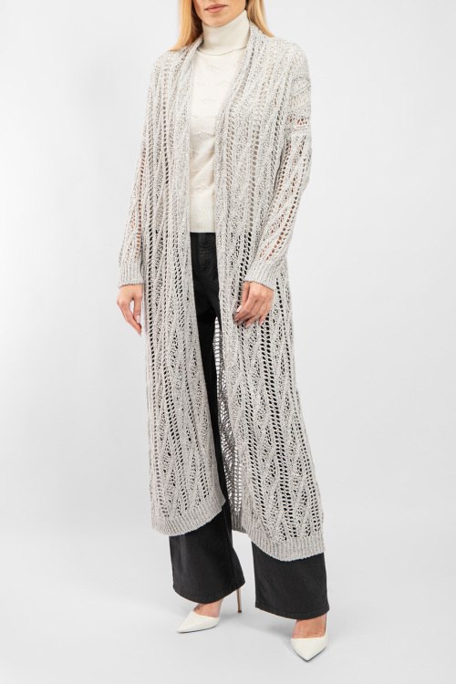 Детали: Женский светло-серый длинный кардиган из льна и хлопка от Panicale Cashmere (Паникале Кашемир). Комбинация материалов, модель без застежки, крупная вязка, длина-миди. Размер вещи на фото: 42. Замеры: длина: 120 см, ширина груди 57 см, ширина по талии 53,5 см, ширина по бедрам: 54 см, длина по внутреннему шву рукава 41 см, ширина рукава 20 см