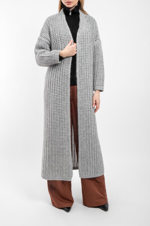 Женский серый кардиган из полиэстера, полиамида и альпаки от Panicale Cashmere (Паникале Кашемир). Удлиненная модель, без застежки, длинный рукав, приспущенная линия плеча. Замеры для размера 40: Длина: 122 см, длина рукава по внутреннему шву: 37 см, ширина рукава: 23 см.