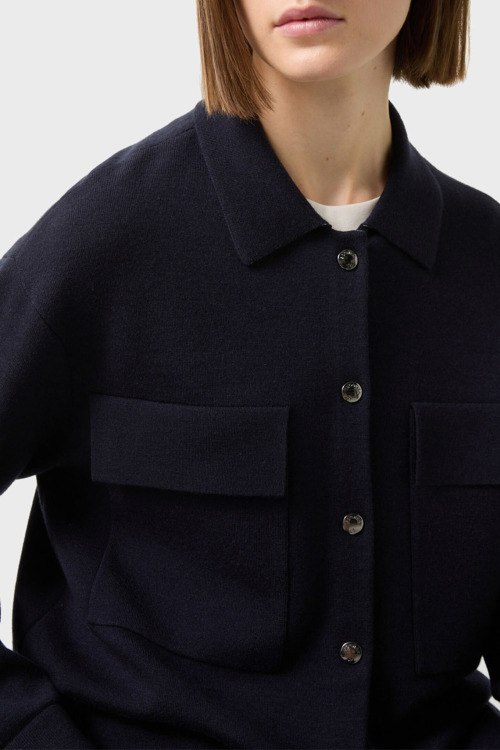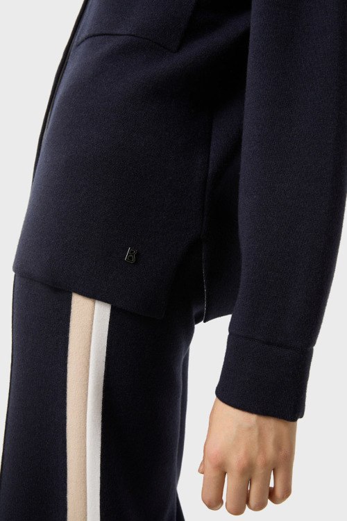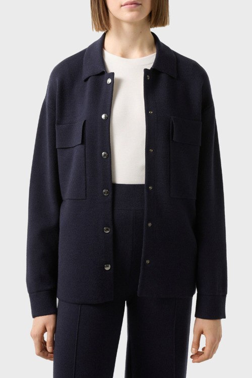 Женский темно-синий кардиган из шерсти и шелка Icaria от Bogner (Богнер). Два накладных кармана на груди, отложной воротник, застежка на кнопки, классическая длина